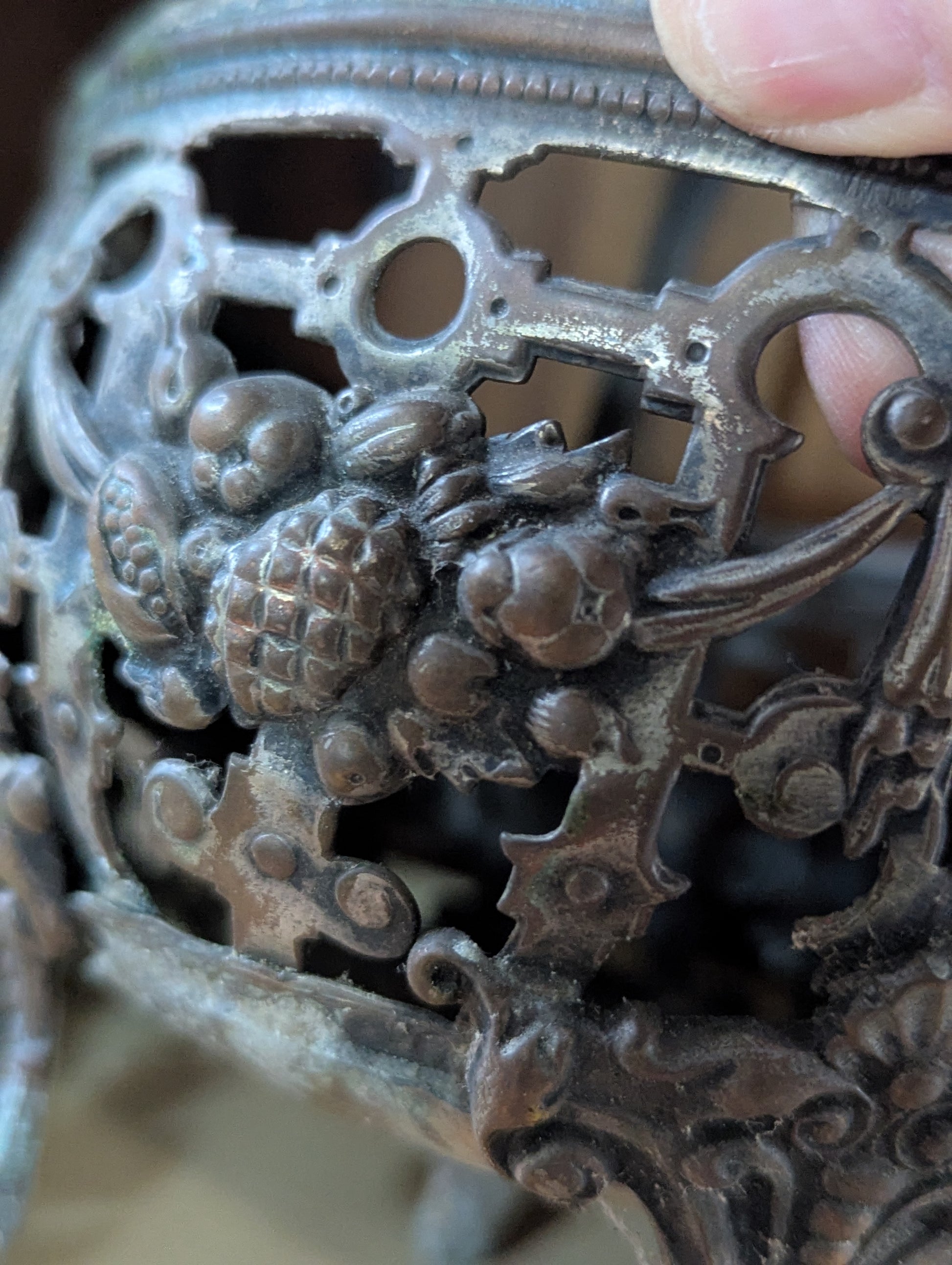 Footed hinged handled basket with patina. Worn to perfection. Feet are slightly off and basket has wiggle.
