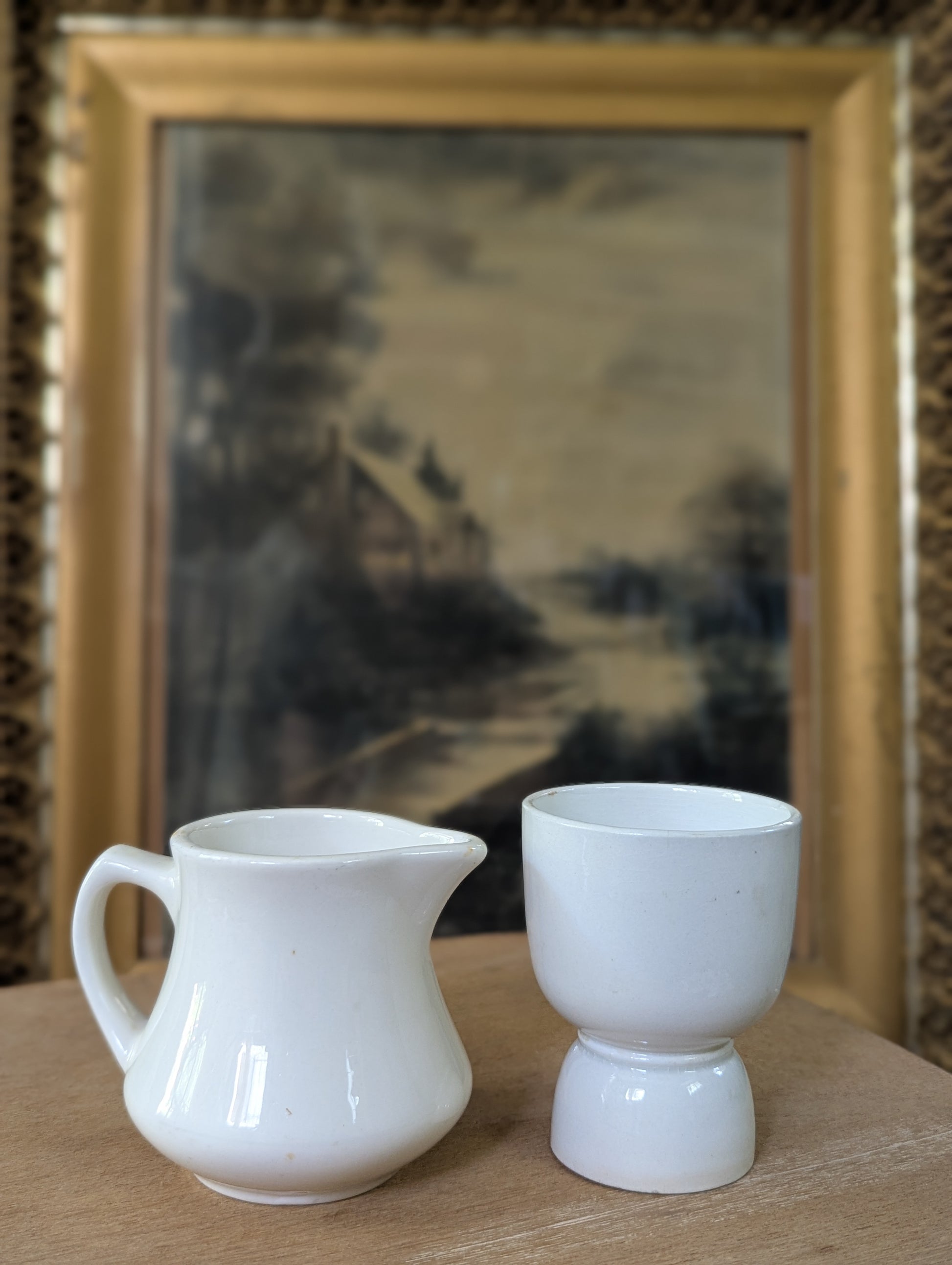 Adorable, marked little creamer with no issues and a sweet egg cup with a manufacturing flaw in the bottom and an area of light staining as seen in photos