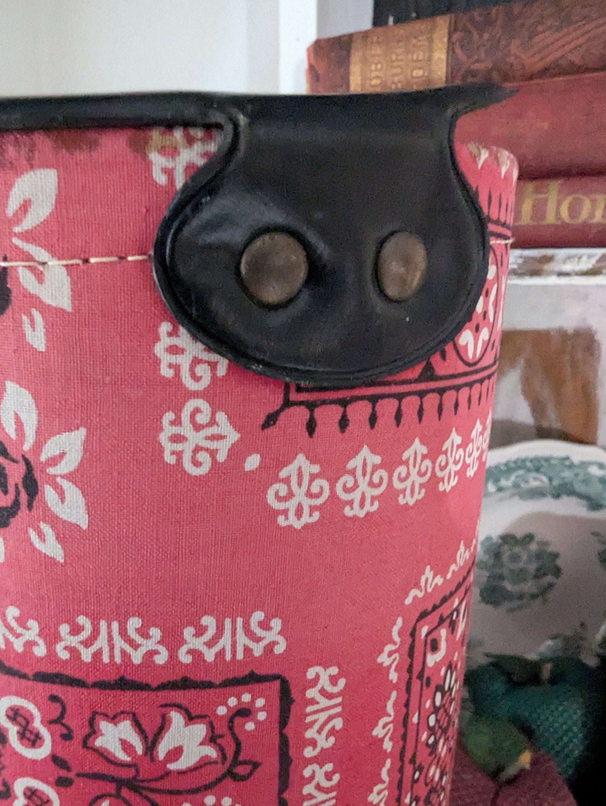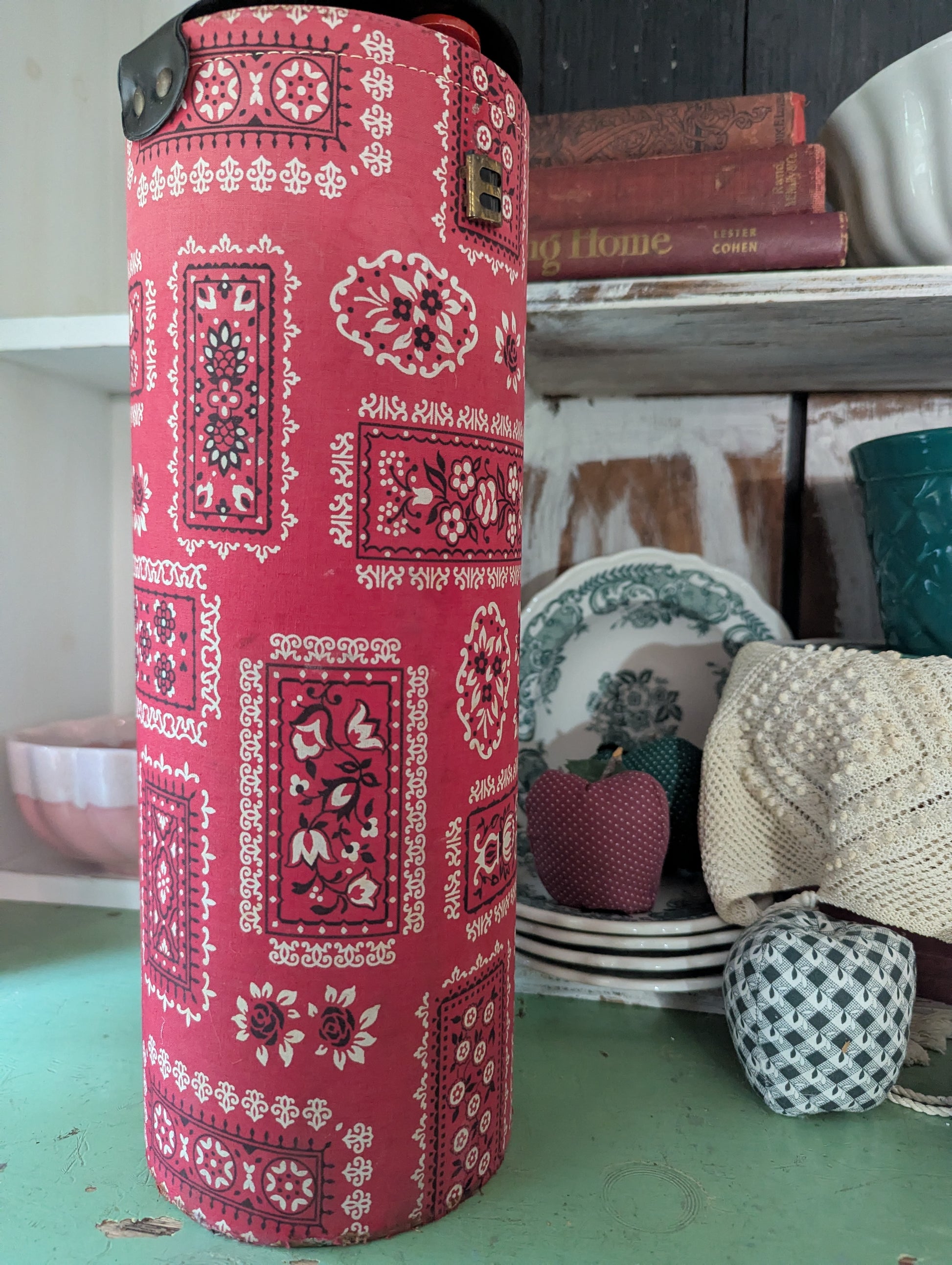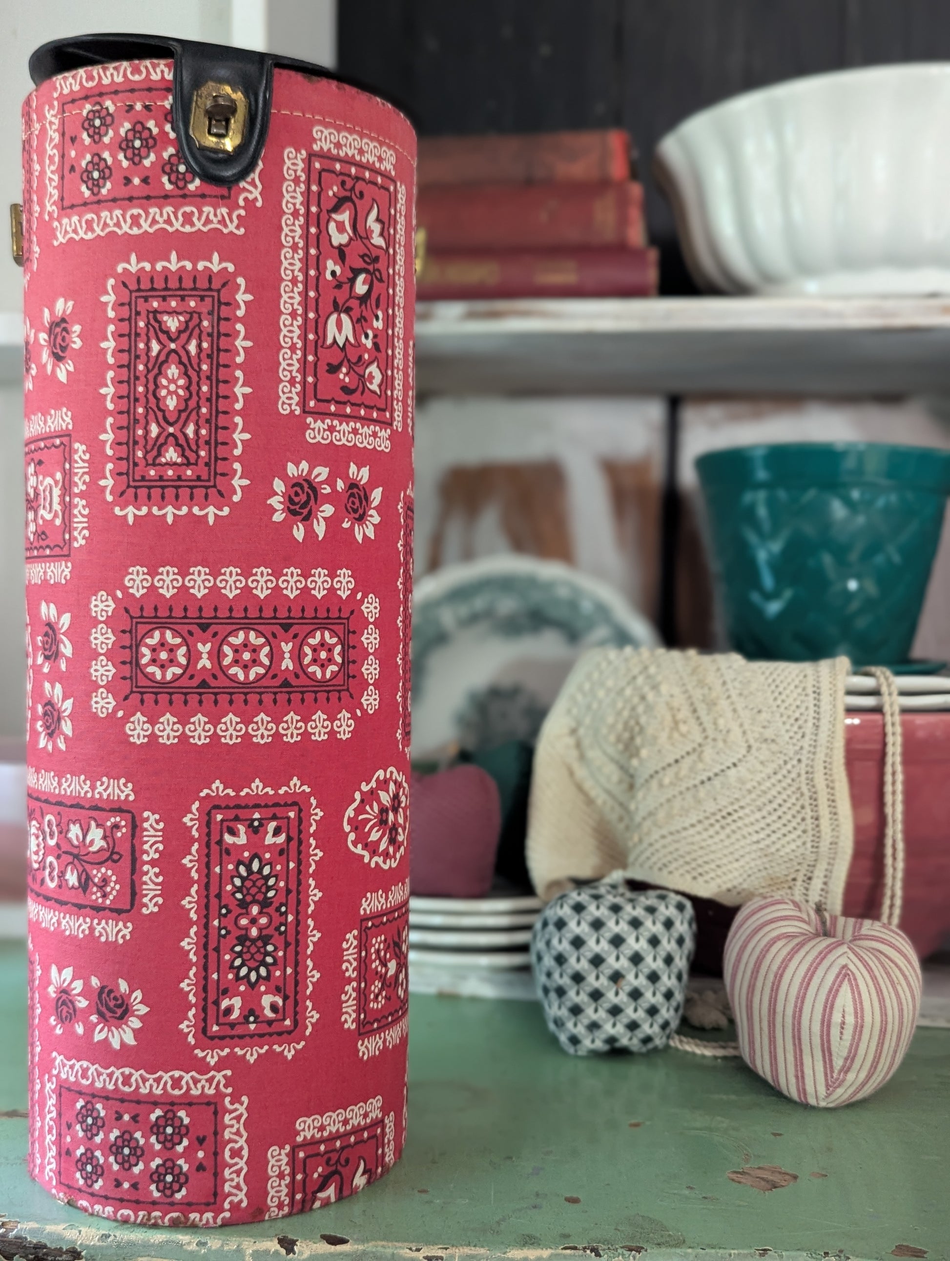 Super sweet fabric covered caddy filled with a bunch of knitting needles. Some wear and fading. Missing strap/handle. Can be storage for so many things! Use to display flags or a Christmas tree. Add to a Valentine display. Hide your favorite chocolates in there. The possibilities are endless.