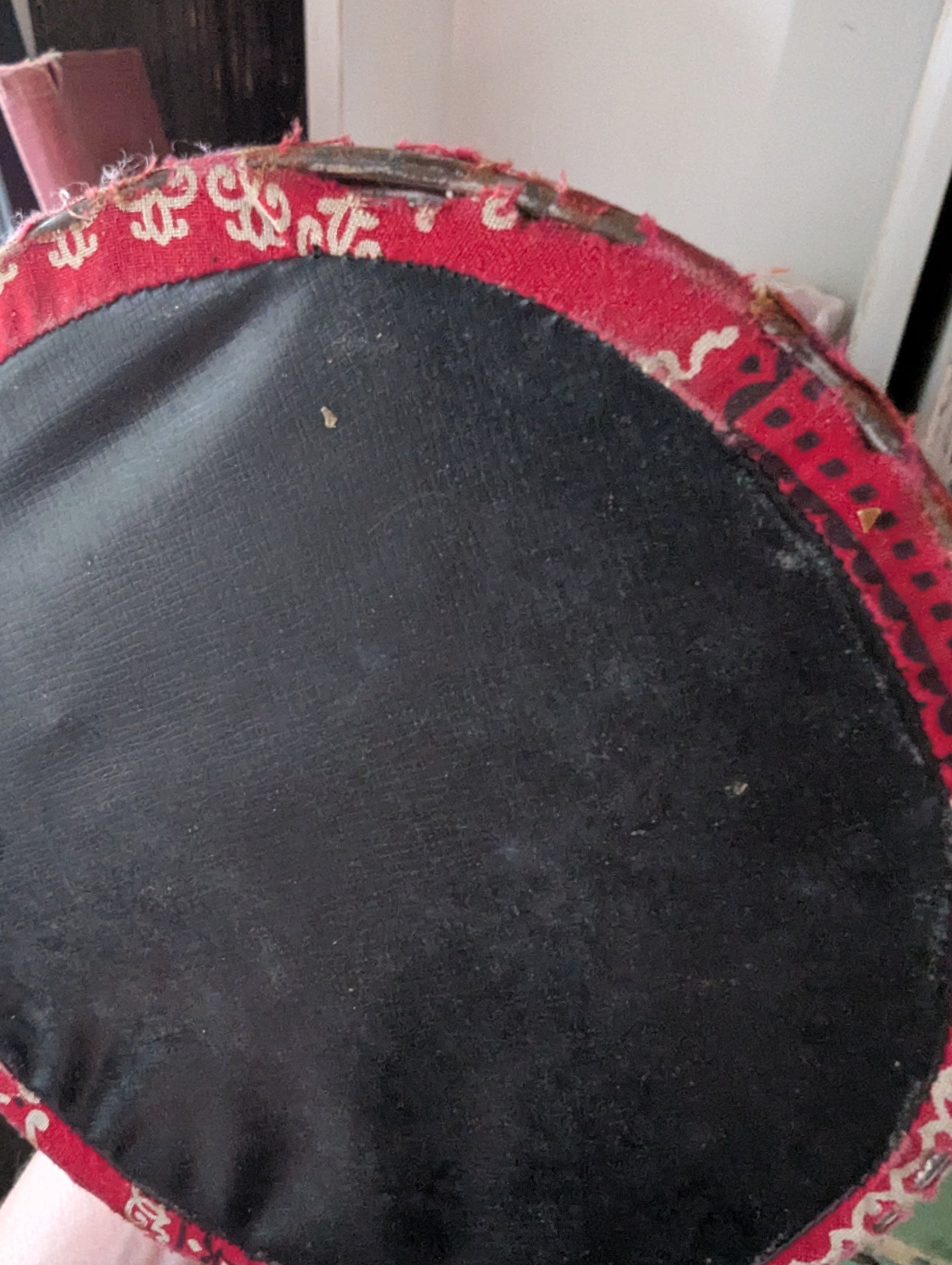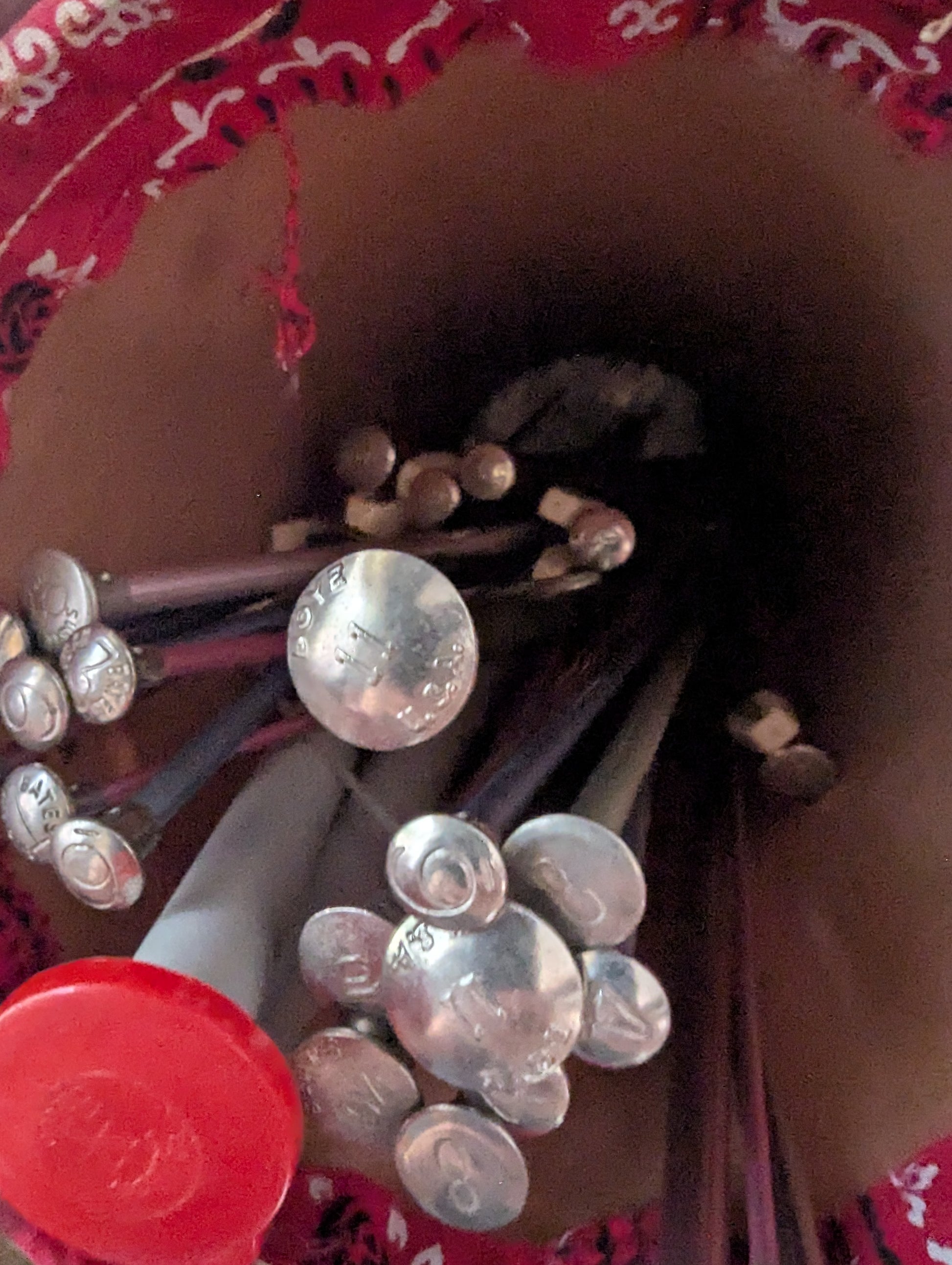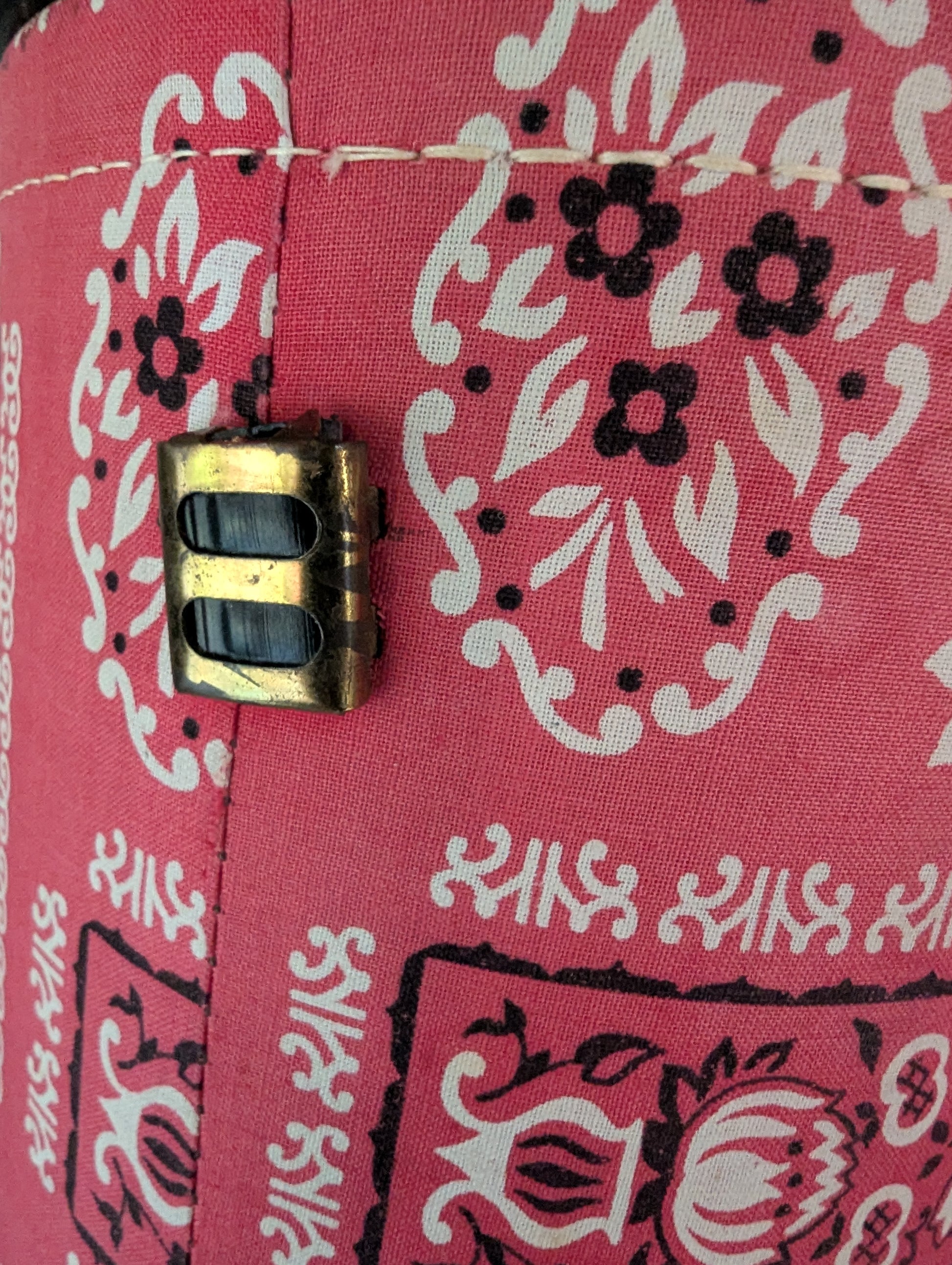 Super sweet fabric covered caddy filled with a bunch of knitting needles. Some wear and fading. Missing strap/handle. Can be storage for so many things! Use to display flags or a Christmas tree. Add to a Valentine display. Hide your favorite chocolates in there. The possibilities are endless.