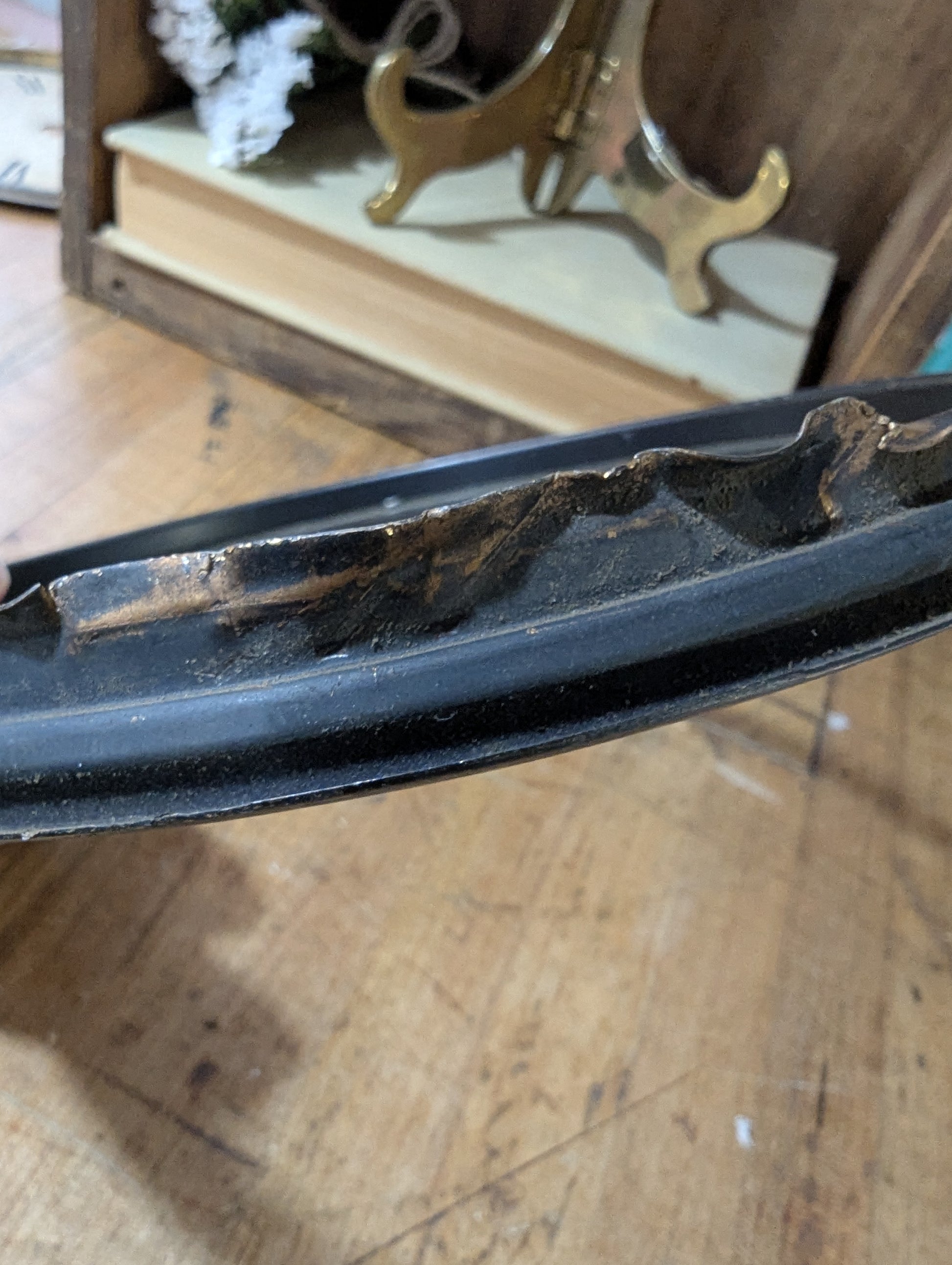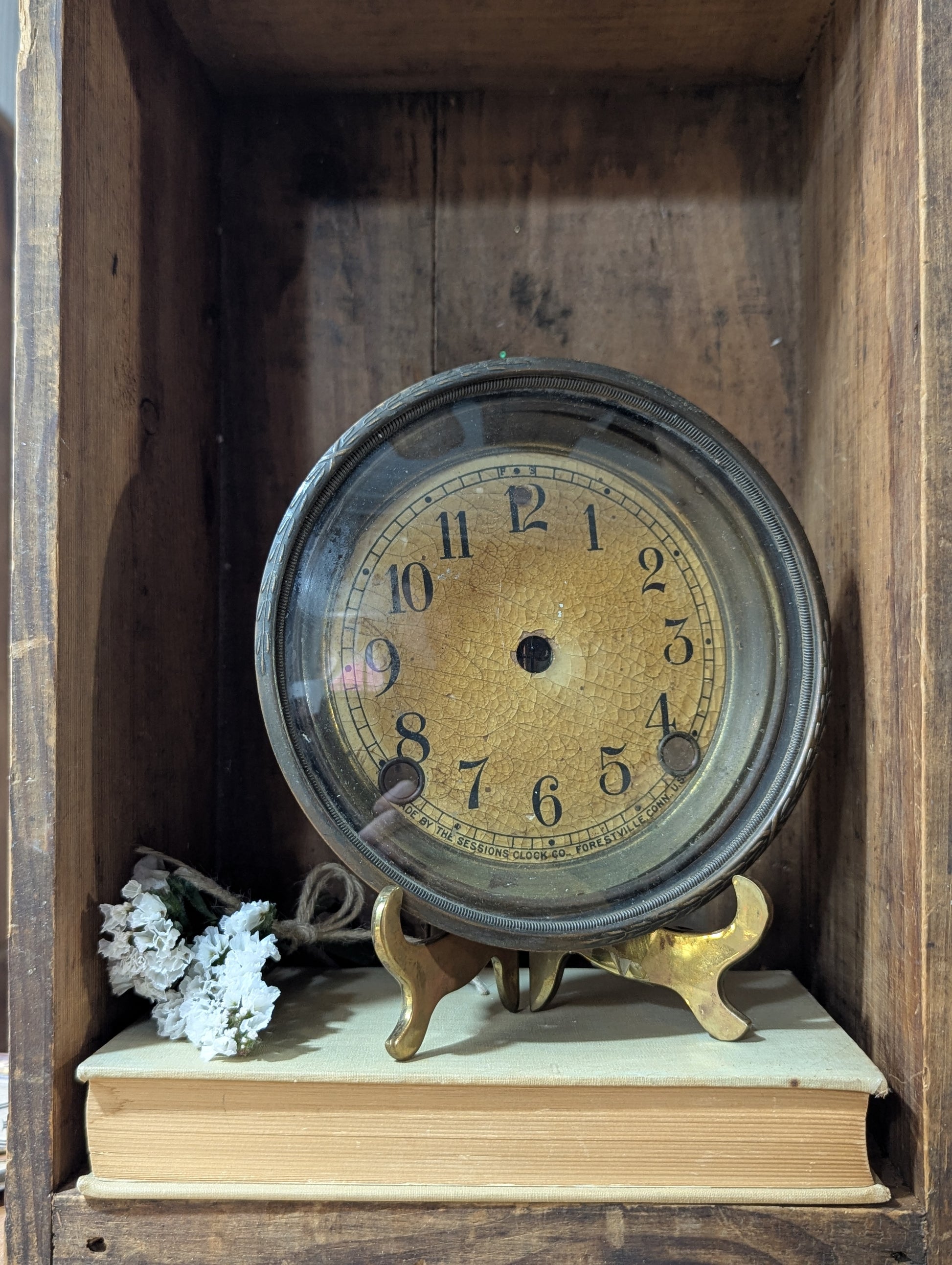 This would be perfect for a shadow box! Beautiful hinged glass bezel has some dents in edge. Wear and patina galore. Crazing. Bezel presses onto face, but will need adhered if being handled.