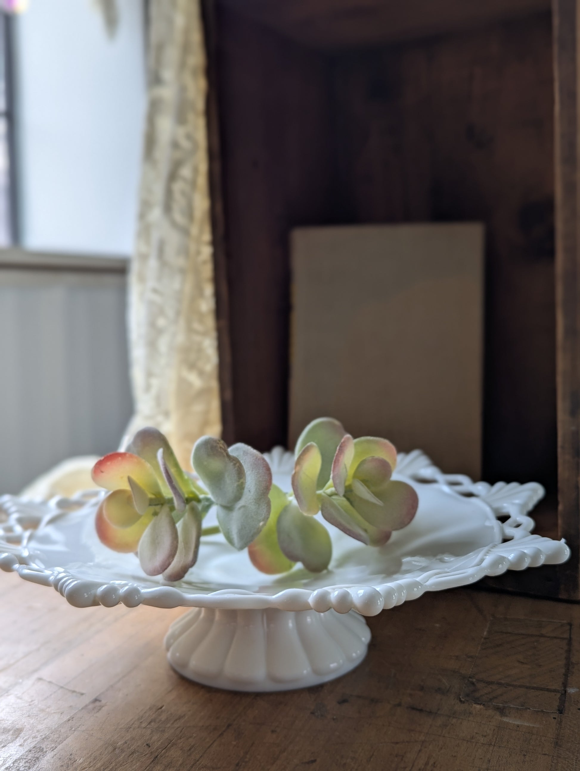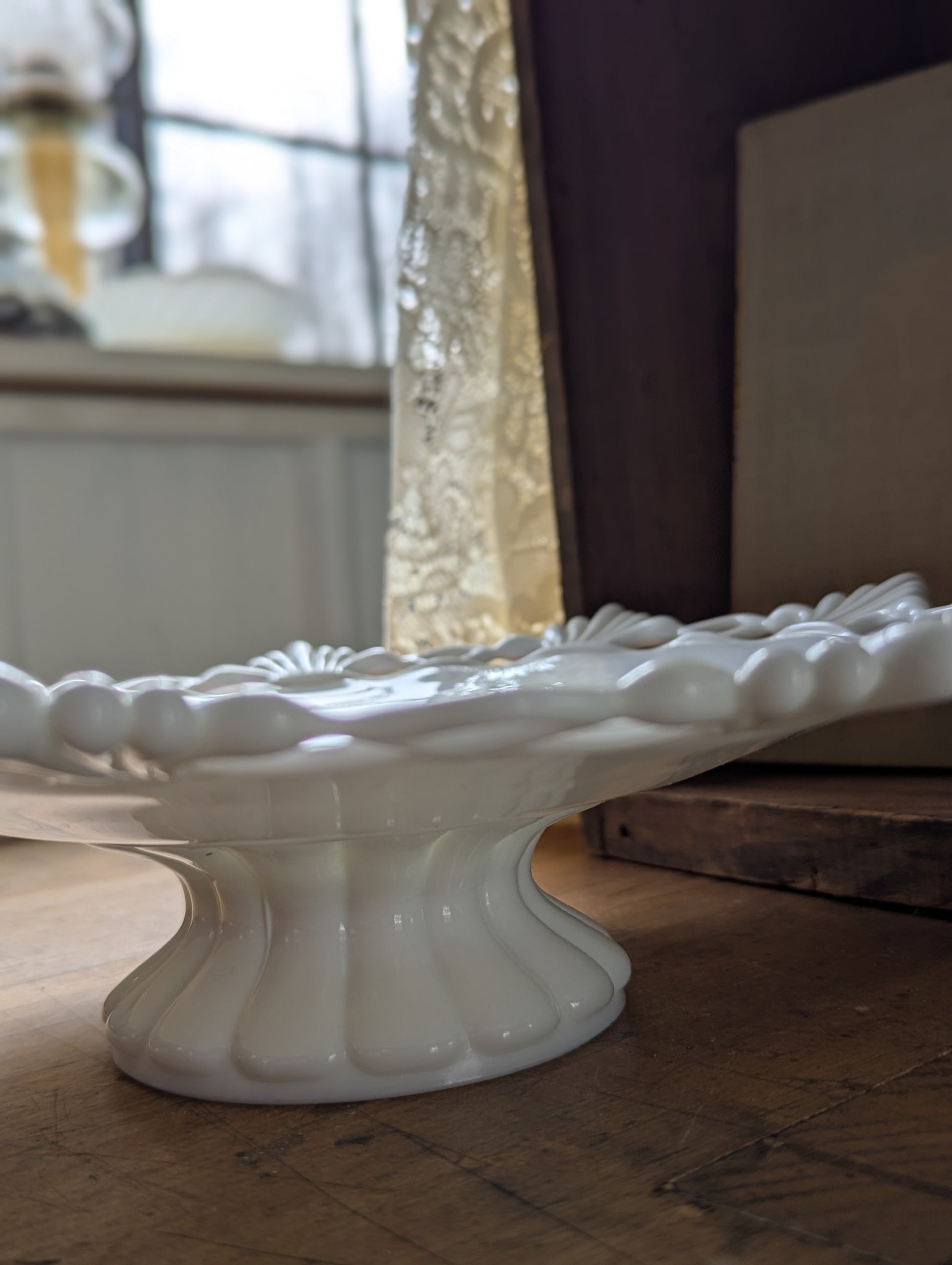 Possibly Westmoreland pedestal cake plate pedestal dish. Delicate, lacy design.