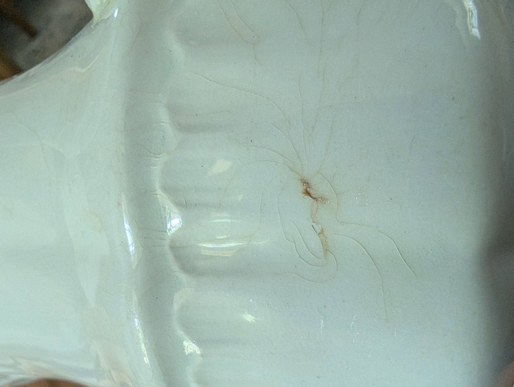 Absolutely gorgeous pair of pitchers with stunning details. These two are a little on the larger side. One stamped MEAKIN, the other unmarked. Some staining on th inside of the unmarked one, and a couple mature fractures as seen in photos, but they do not affect integrity of pieces. Large chip on bottom of Meakin.