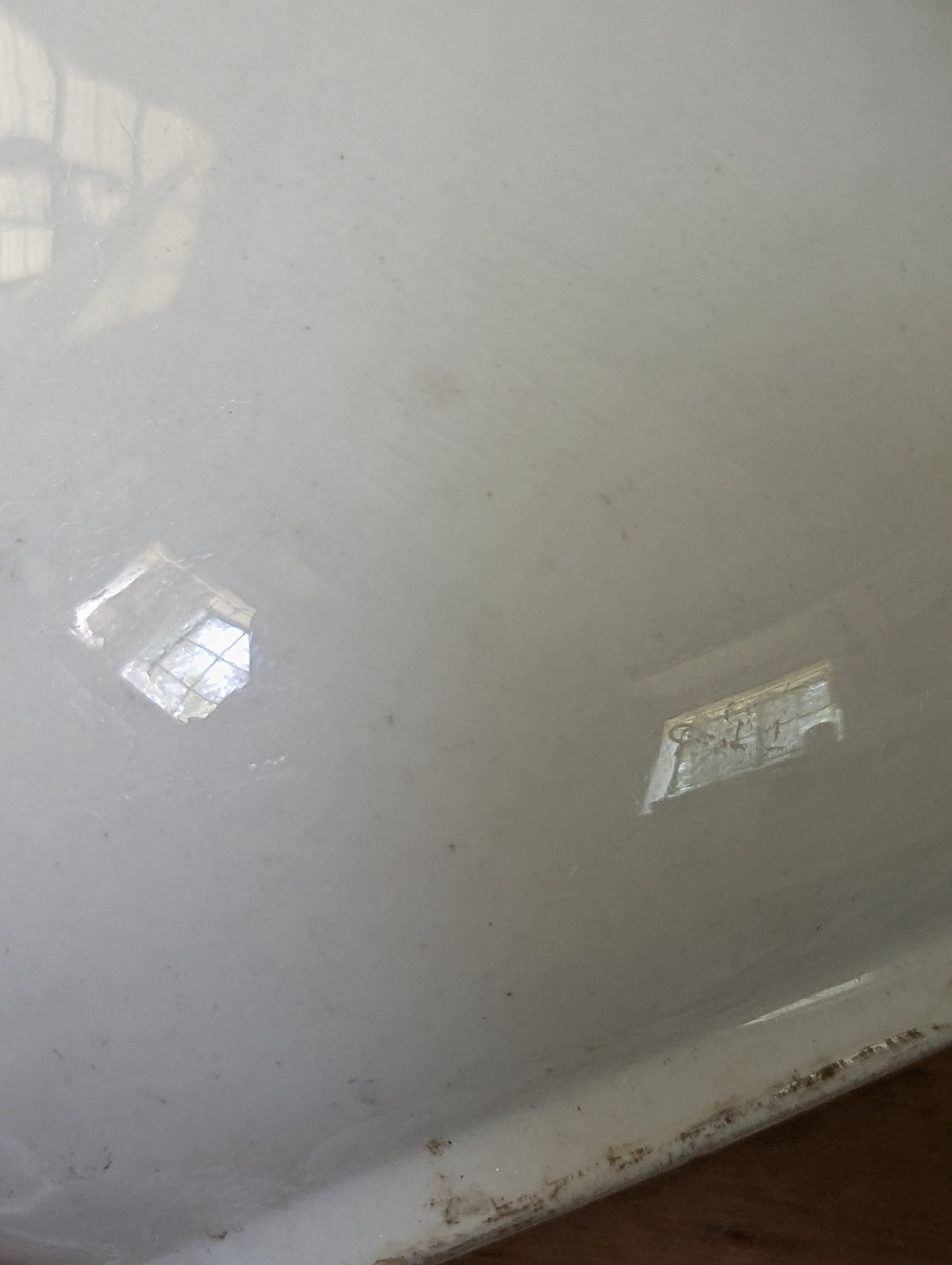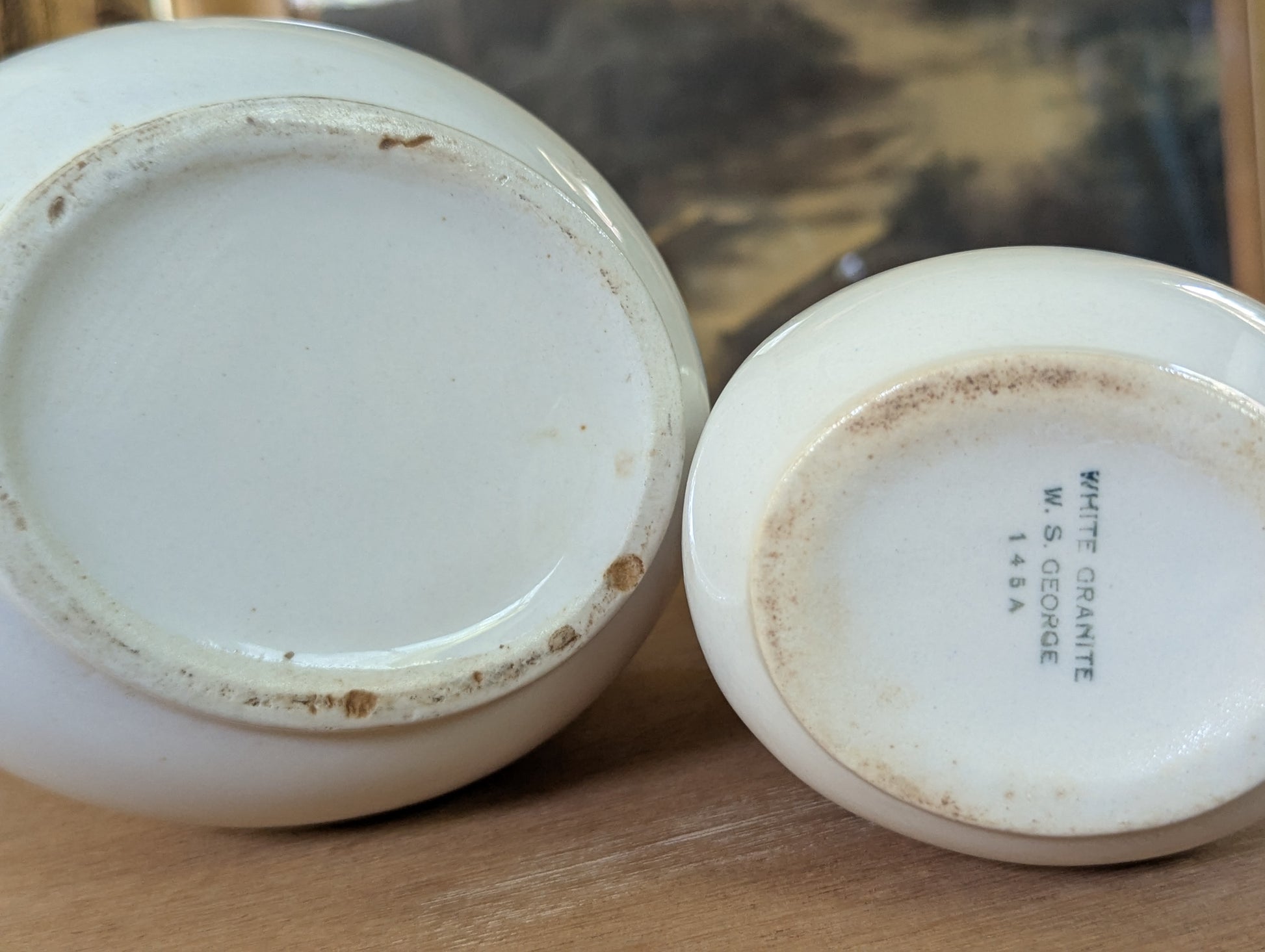 Set of two. These two sweet pitchers will fit right into your country cottage or farmhouse. The large stonwareone piece is unmarked. The small is marked WHITE GRANITE W.S. GEORGE.