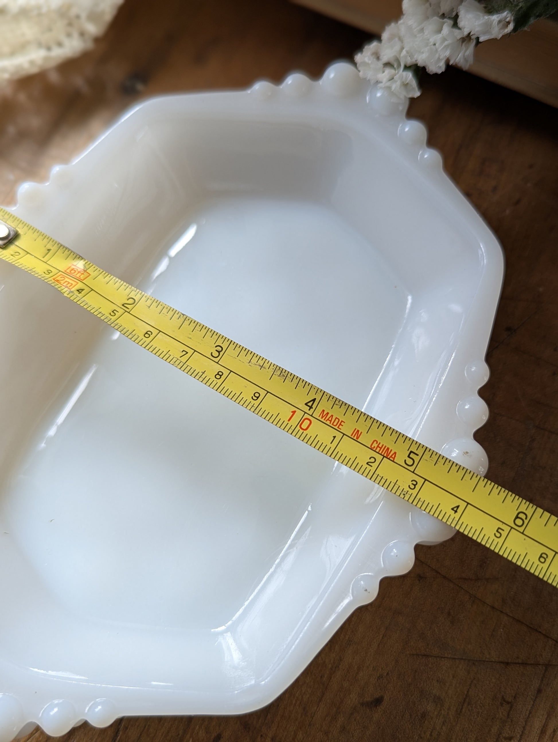Set of 3 vintage Anchor Hocking milk glass dish, likely used as a soap dish, candy dish, or jewelry holder.