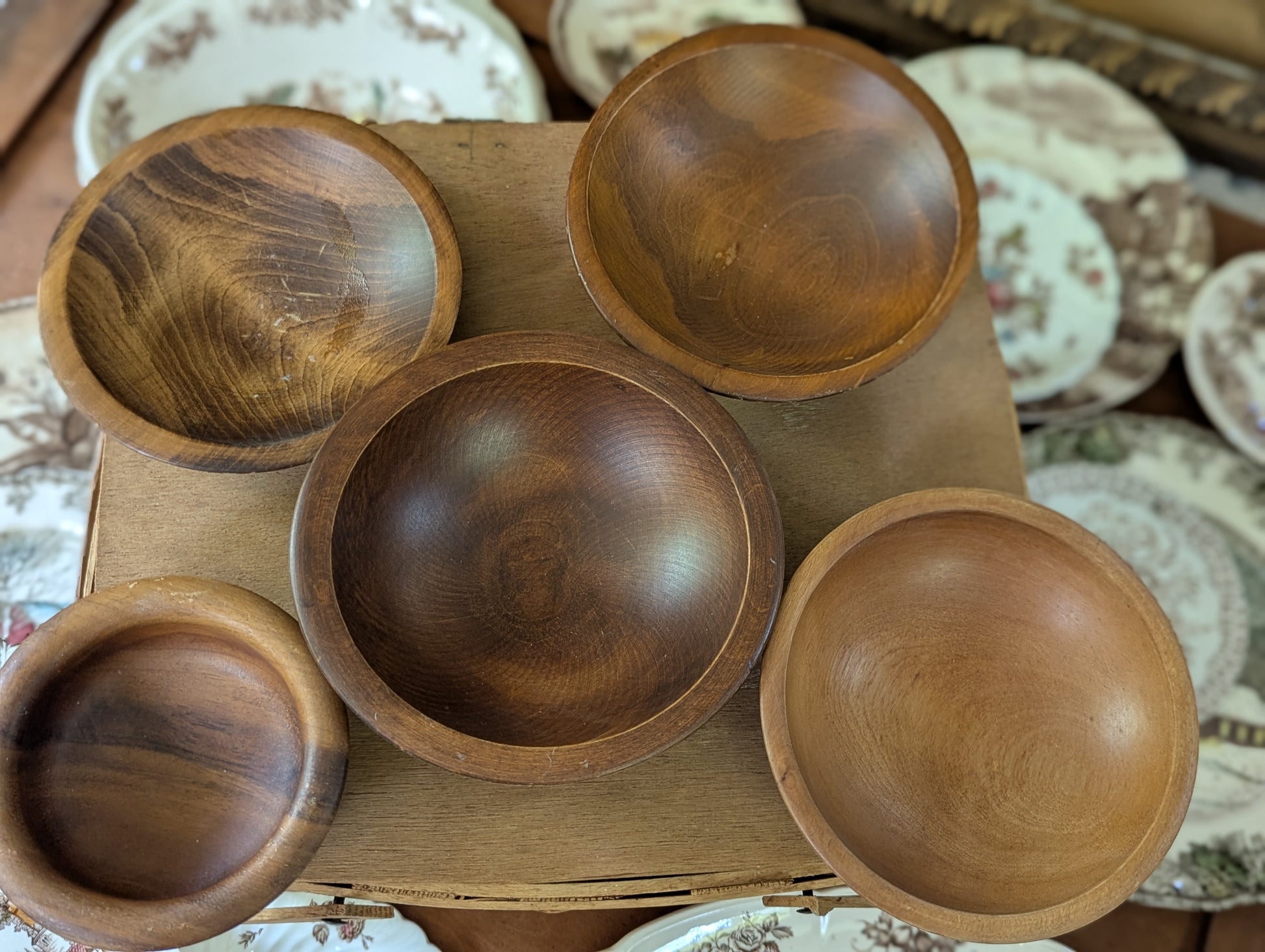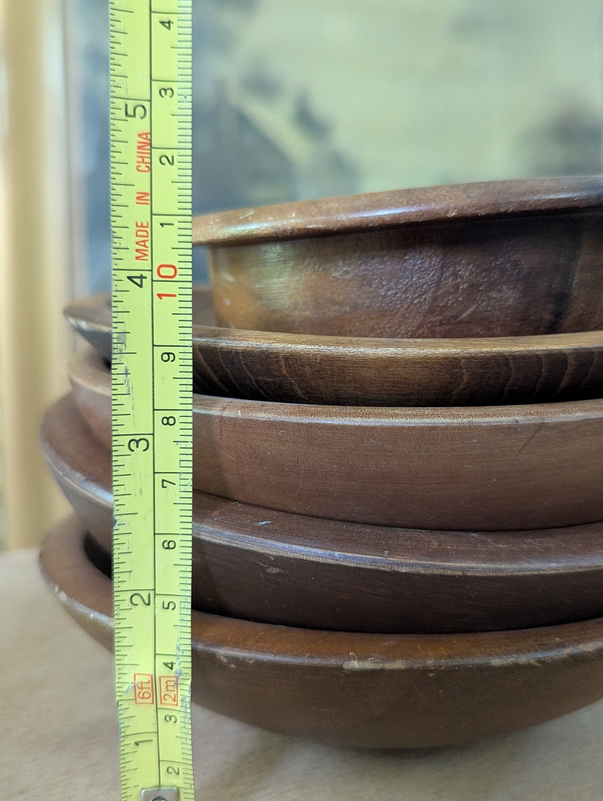 Super sweet stack of mismatched wooden bowls. Differing shapes and stains add to the charm of this stack.